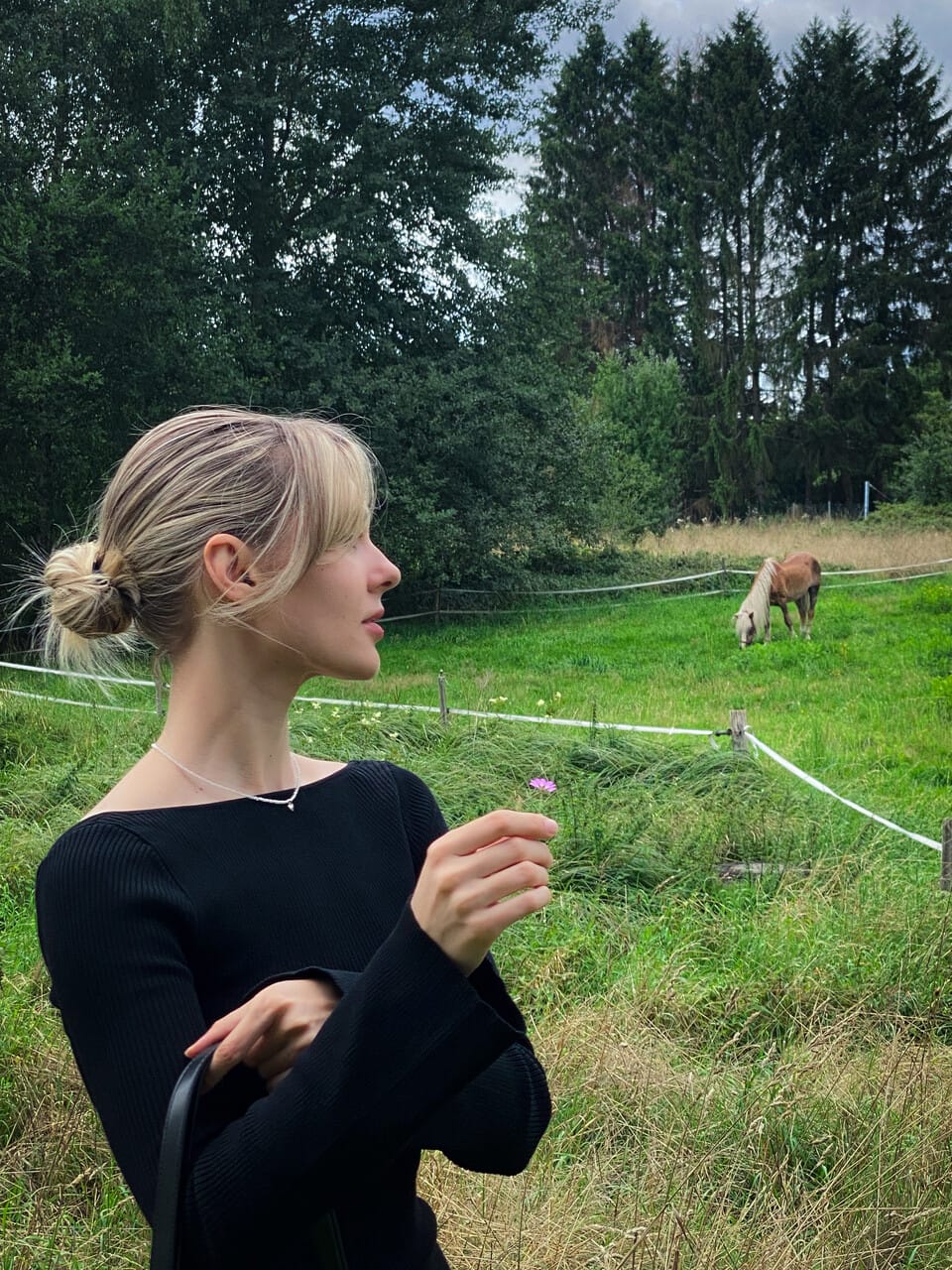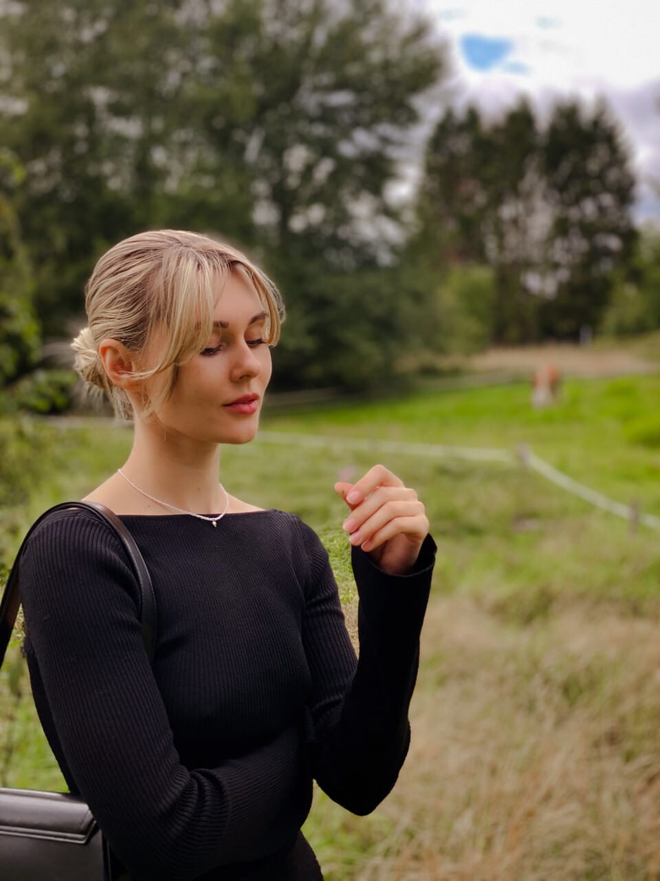 Breann McGregor szőke lány virágokat szed a természetben, miközben megmutatja a hatalmas melleit