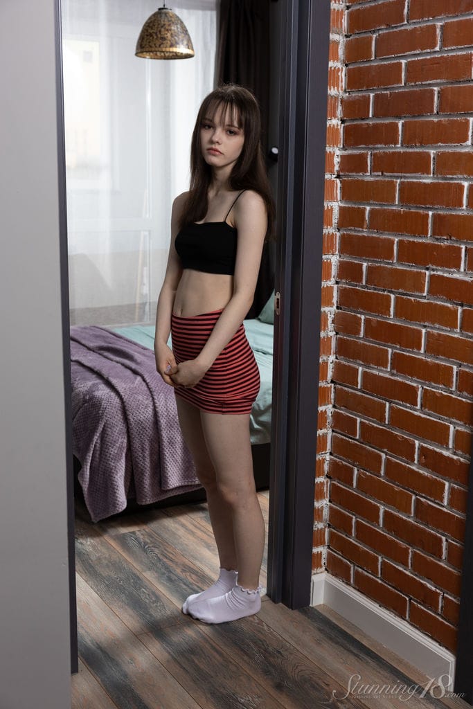 A vékony diáklány, Alyssa K, megmutatja a gyönyörű lábait és a kopasz punciját meztelenül