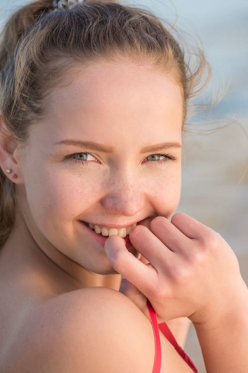 Szeretnivaló tinédzser, Faina Bona, karcsú testével a strandon mutatkozik meg